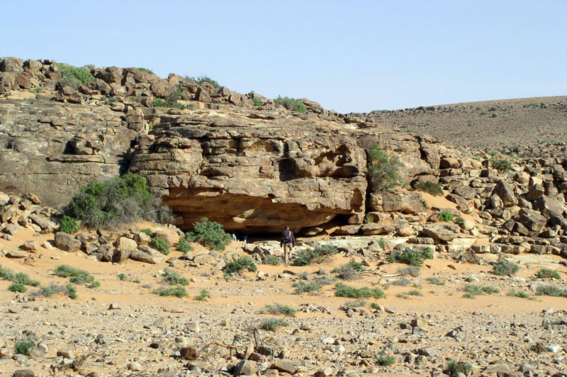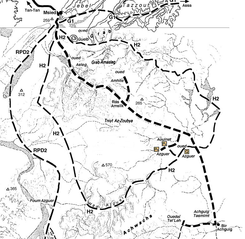 Un site qui a révélé l’importance des peintures rupestres au Sud de la chaîne des jebels Tazzout et Ouarkziz. Connues par de rares pasteurs nomades qui n'en soupçonnaient pas l'intérêt, ces peintures ont été réellement inventées au début des années 2000 par Jacques Gandini et son équipe, alors en reconnaissance pour la préparation de la première édition du tome 3 du Guide 4x4 des Pistes du Maroc dans lequel elles ont été publiées pour la première fois en 2002. Cette découverte, l'une des plus importantes au Maroc, a suscité un regain d'intérêt pour l'art rupestre saharien et a permis, par la suite, l'invention de nombreux autres sites dans la même région, notamment celui de l'oued Tel'Leh, en 2006. Les abris sous-roches contenant les peintures sont situés de part et d’autre de l’oued asséché, affluent de l’oued Azguer. Selon les descriptions fournies par R. Létan (rapport interne) et par S. Searight et G. Martinet (2002), les sujets peints sont variés et probablement de styles et d’époques différentes. Les figures peintes à l’entrée et à l’intérieur, sur le plafond, se distingueraient de celles des panneaux dessinées au fond de l’abri principal. La totalité des peintures a été effectuée à l’ocre rouge, soit aux traits fins, soit par des aplats. On ne retrouve pas la faune tropicale à laquelle on pouvait s’attendre à l’exception d’un lion et quelques autruches, mais une majorité de bovidés et d’antilopes et peut-être de moutons. Par contre les représentations humaines (dont certaines sexuées) sont nombreuses. Les anthropomorphes sont caractérisés par des fesses prononcées et des cuisses larges. On note la présence de plusieurs personnages armés d’arcs, ainsi que des frises de plusieurs dizaines de petits sujets stylisés sensés représenter des anthropomorphes. Certains sujets atteignent plusieurs dizaines de centimètres de hauteur. Un petit abri présente une voûte garnie d’un mouchetis de points ocre rouge. Beaucoup de peintures proposent des figures indéterminées. De nombreux tumulus préislamiques, dont certains présentant quelques particularités, occupent les terrasses amont de l’oued. Il n’a pas été découvert de gravures rupestres dans le secteur. |