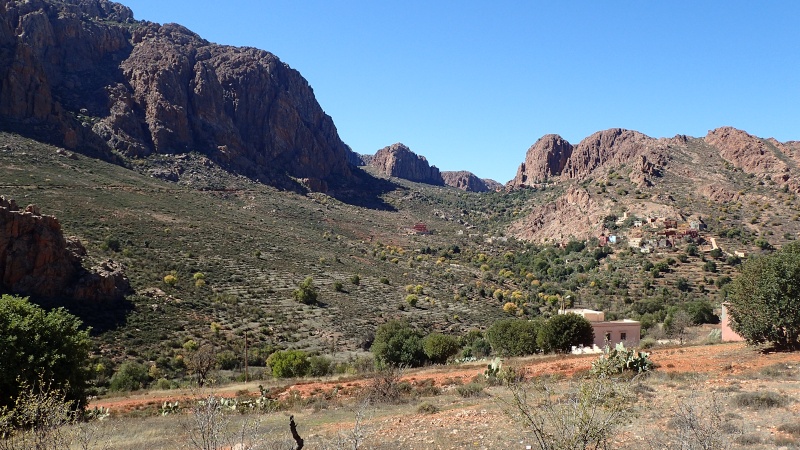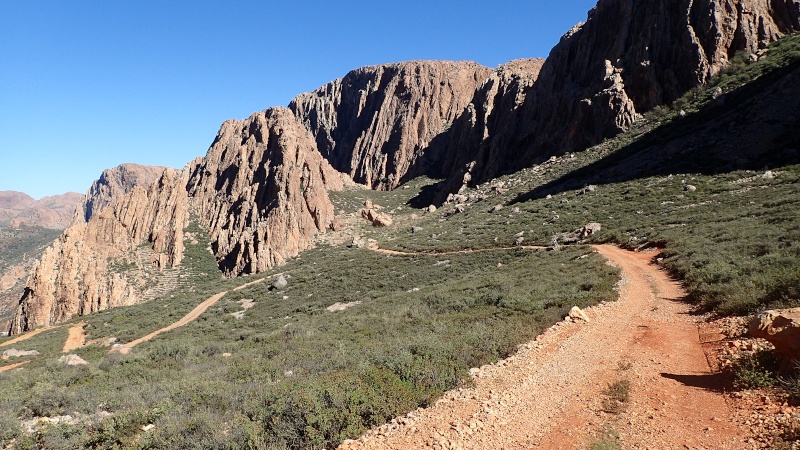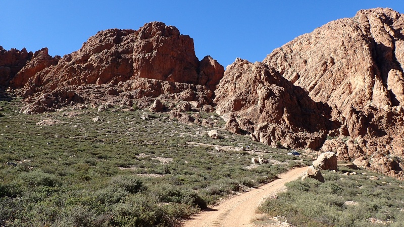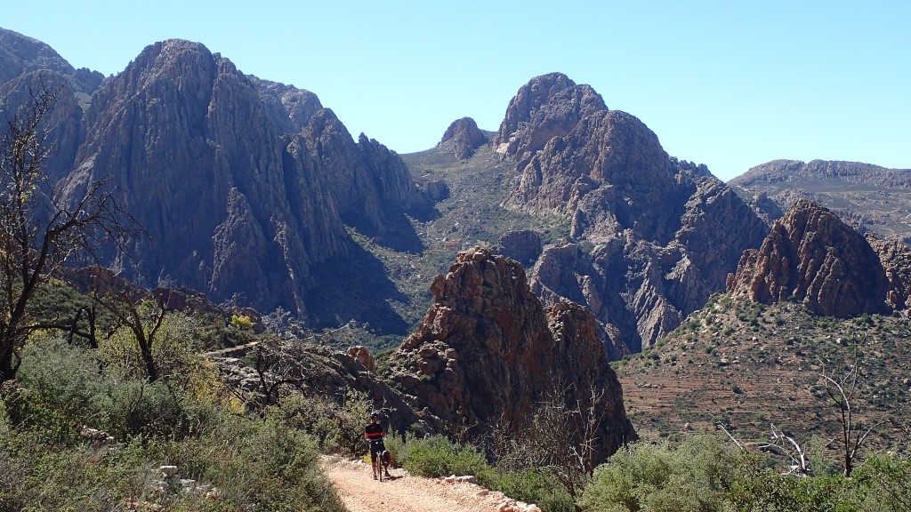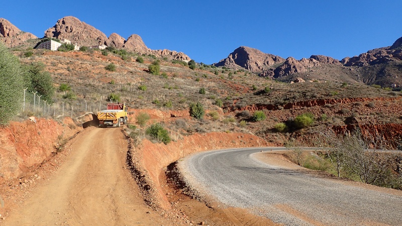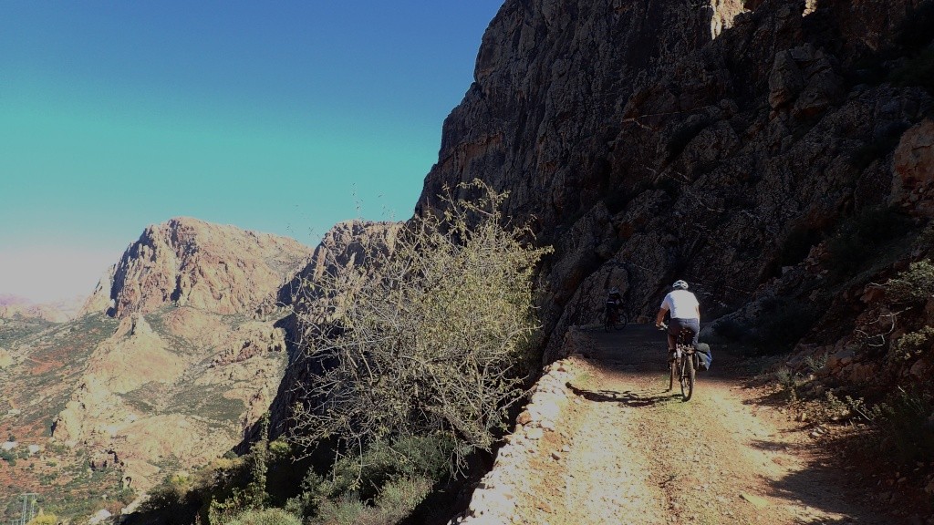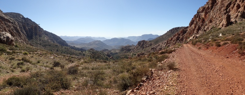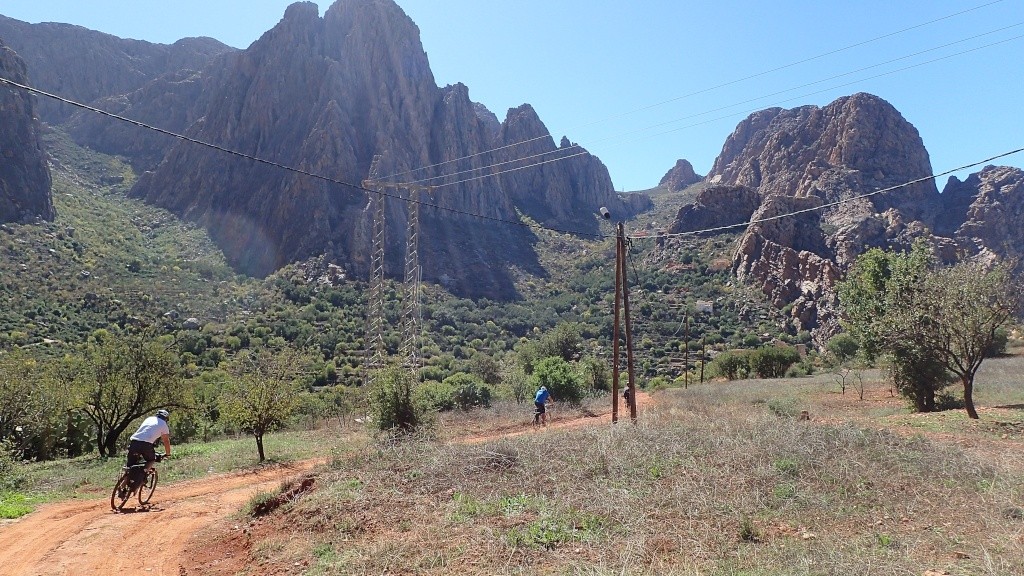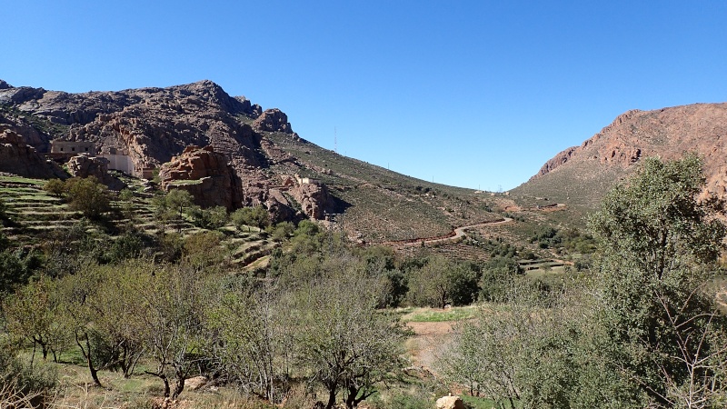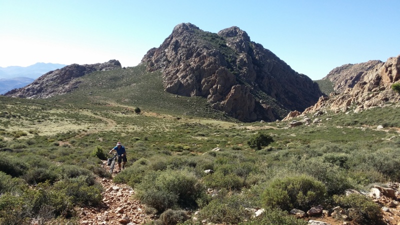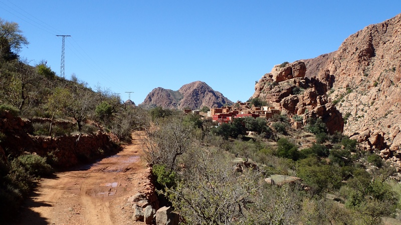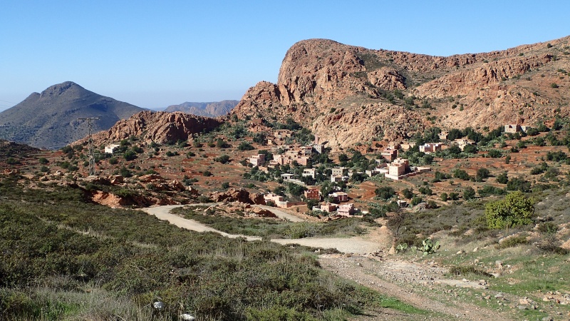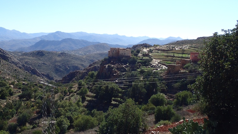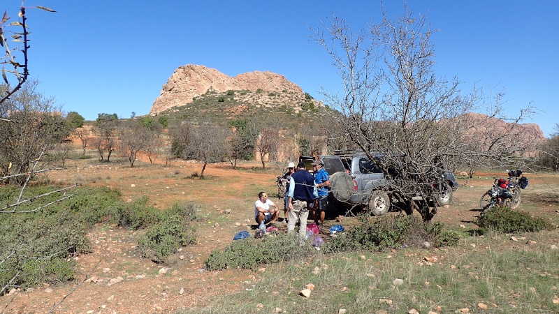 Nous voici arrivés au carrefour avec la piste que nous allons prendre, et qui va nous ramener vers l'ouest. Il est à peine midi, nous décidons de rouler encore un peu. Dans 6km, il y a un petit col, et je dis à Boulemane de nous attendre là-bas pour le picnic. Piste super agréable serpentant au milieu d'un maquis parsemé de village tout colorés.