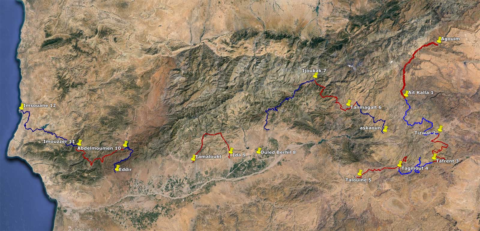 • 8e étape : Ijoukak - Ouled Berhil ( en prenant 9km apres le tizi n'test, une piste qui rejoint Ouled Berhil) 75 km D+ 1160