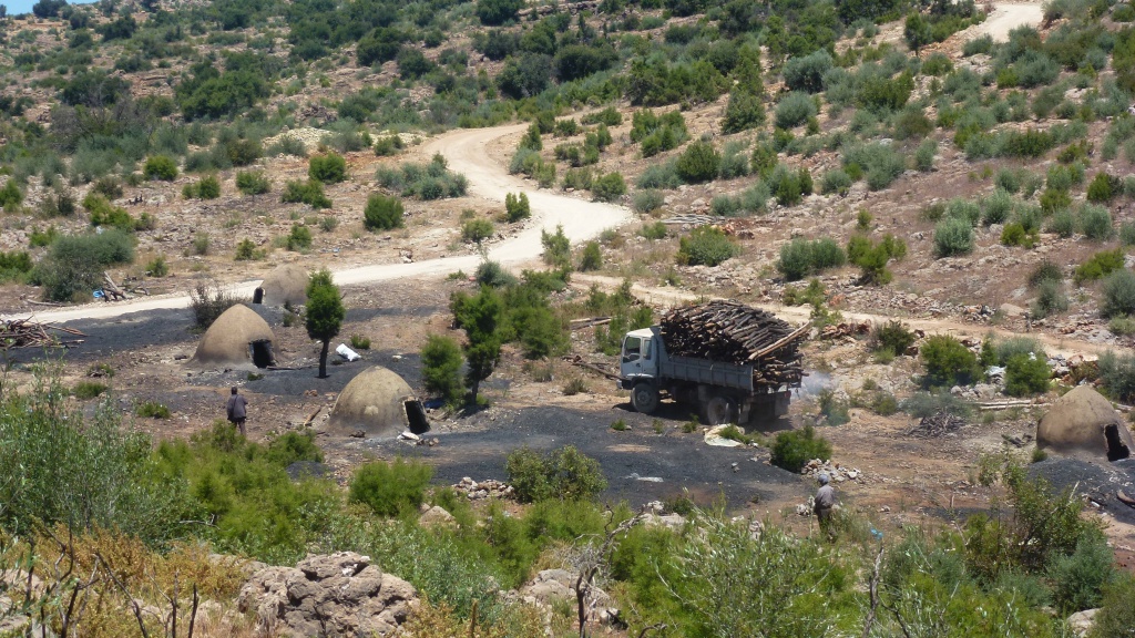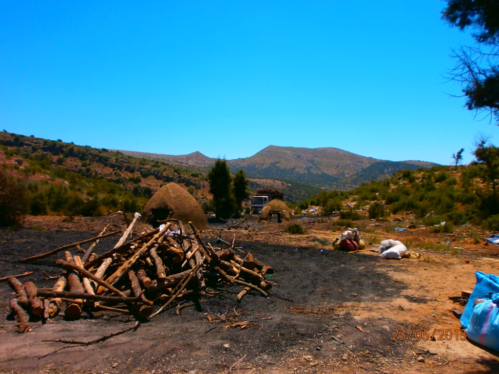 Après une courte pause, on démarre à la descente, sur environ 4 km, avant de réattaquer une seconde montée (moins raide, celle là), et de tomber sur des charbonniers en plein boulot. A priori (si j'ai bien compris) ces gens se déplacent pour fabriquer à la demande du charbon de bois.