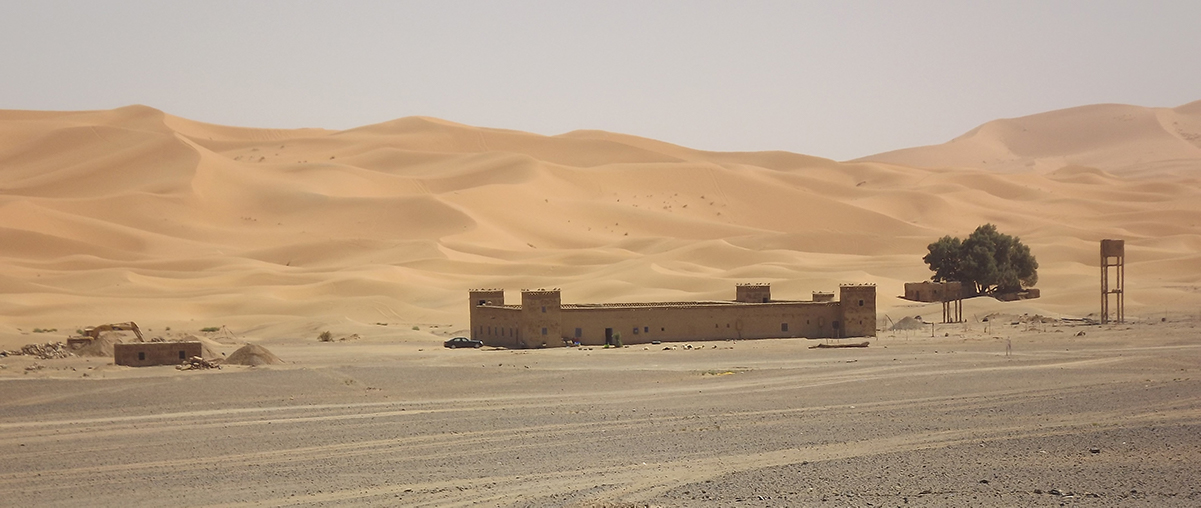 Face aux dunes, sur la gauche. Arbre à pique-nique près des dunettes. Continuer la piste pour Merzouga. |