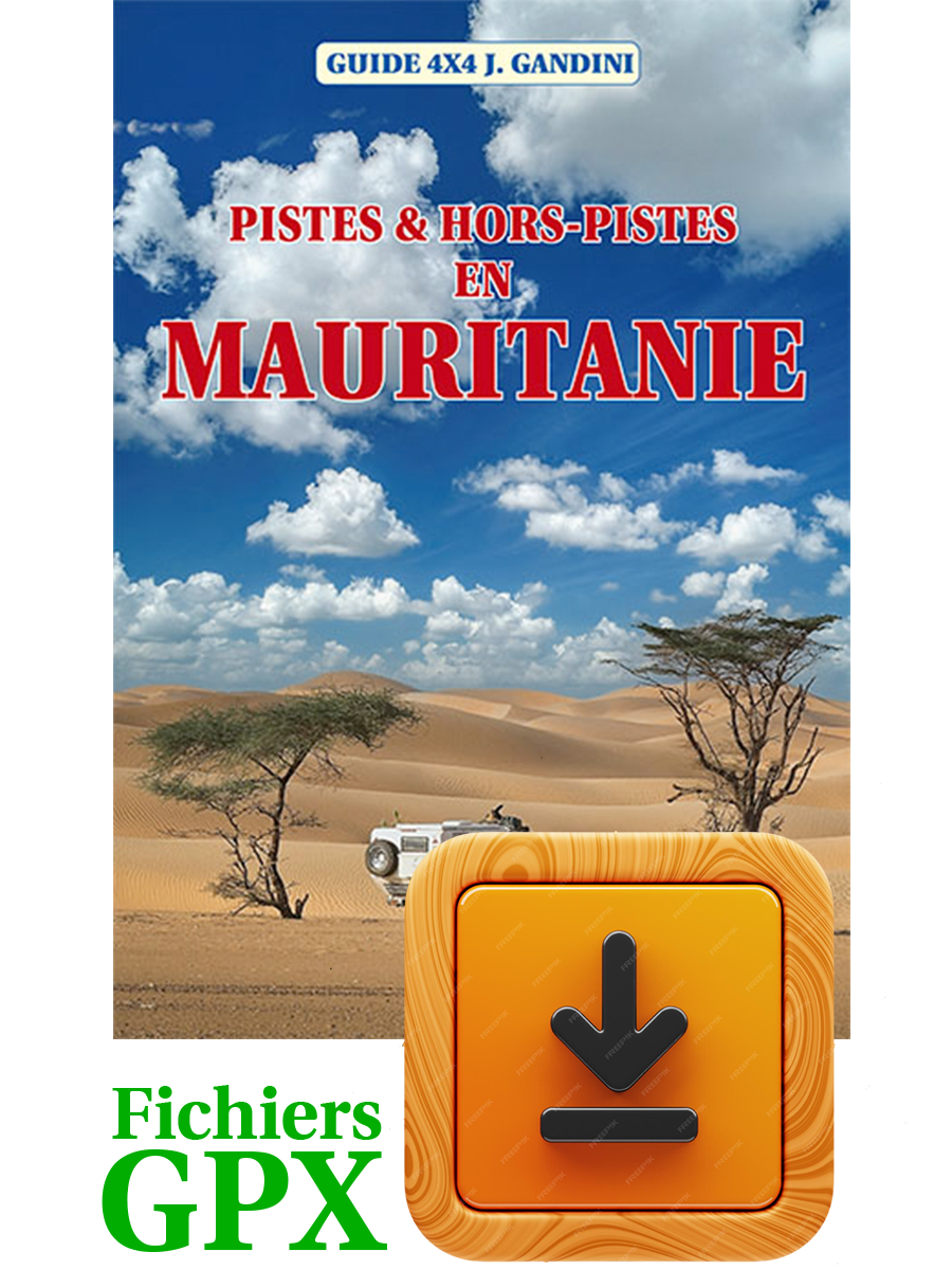 La totalité des parcours du Guide Gandini Pistes et hors pistes en Mauritanie en fichier au format GPX à intégrer dans votre GPS (vérifier qu'il accepte bien les importations de fichier et le format universel GPX).