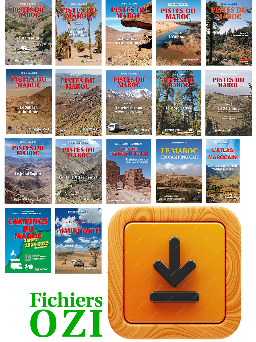 Contenu : Tome 1/2016, Tome 2/2013, Tome 3/2013, Tome 4/2012, Tome 5, Tome 6, Tome 7; Tome 8; Tome 9; Tome 10; Tome 11;Tome 12; Premières Pistes ; Campings du Maroc 2024-2025, Route Charles de Foucauld. Sont également fournis les fichiers des précédentes éditions des Tomes 1, 2, 3, 4 et 6. En tout, 20 dossiers d'itinéraires et de waypoints.